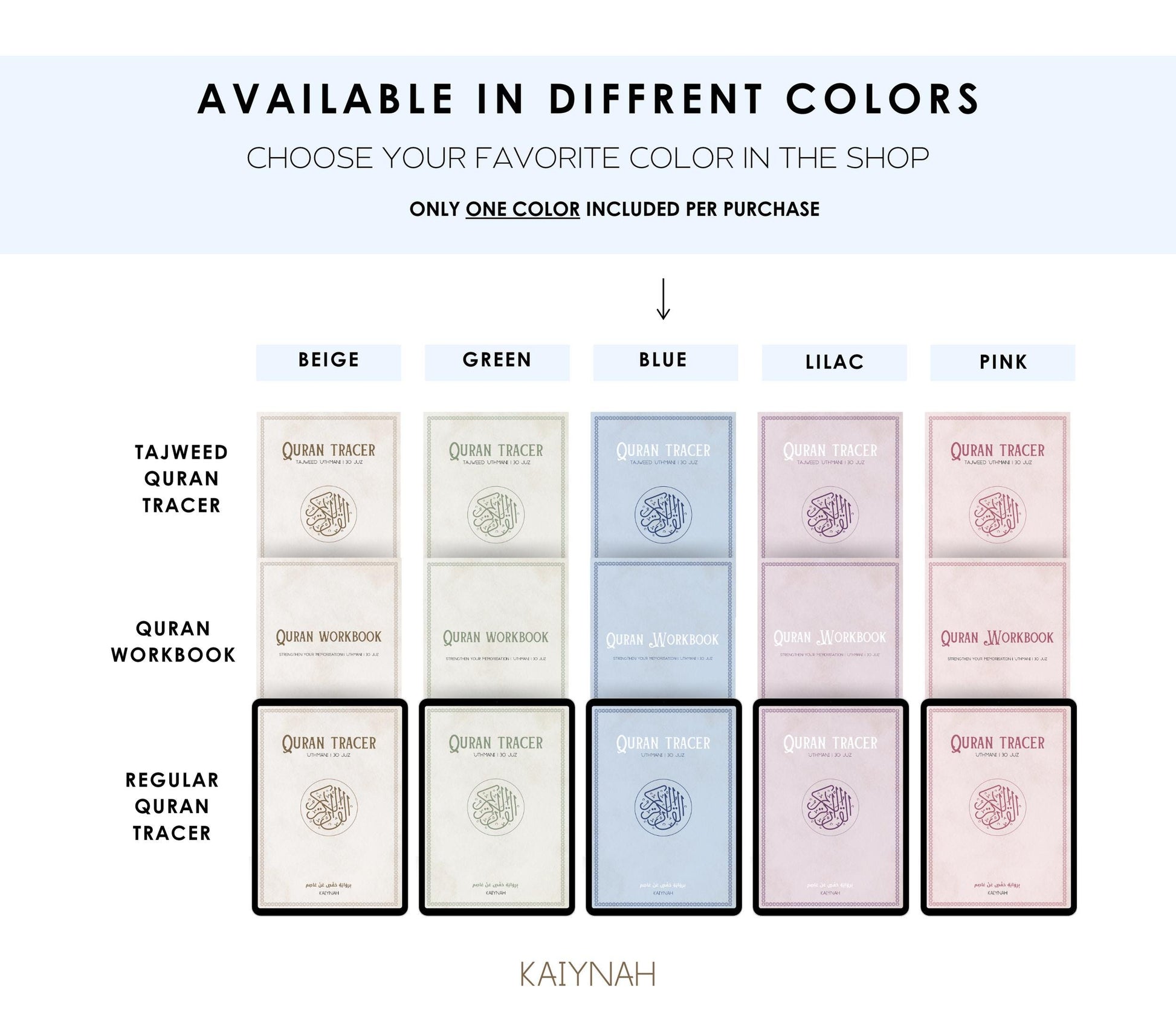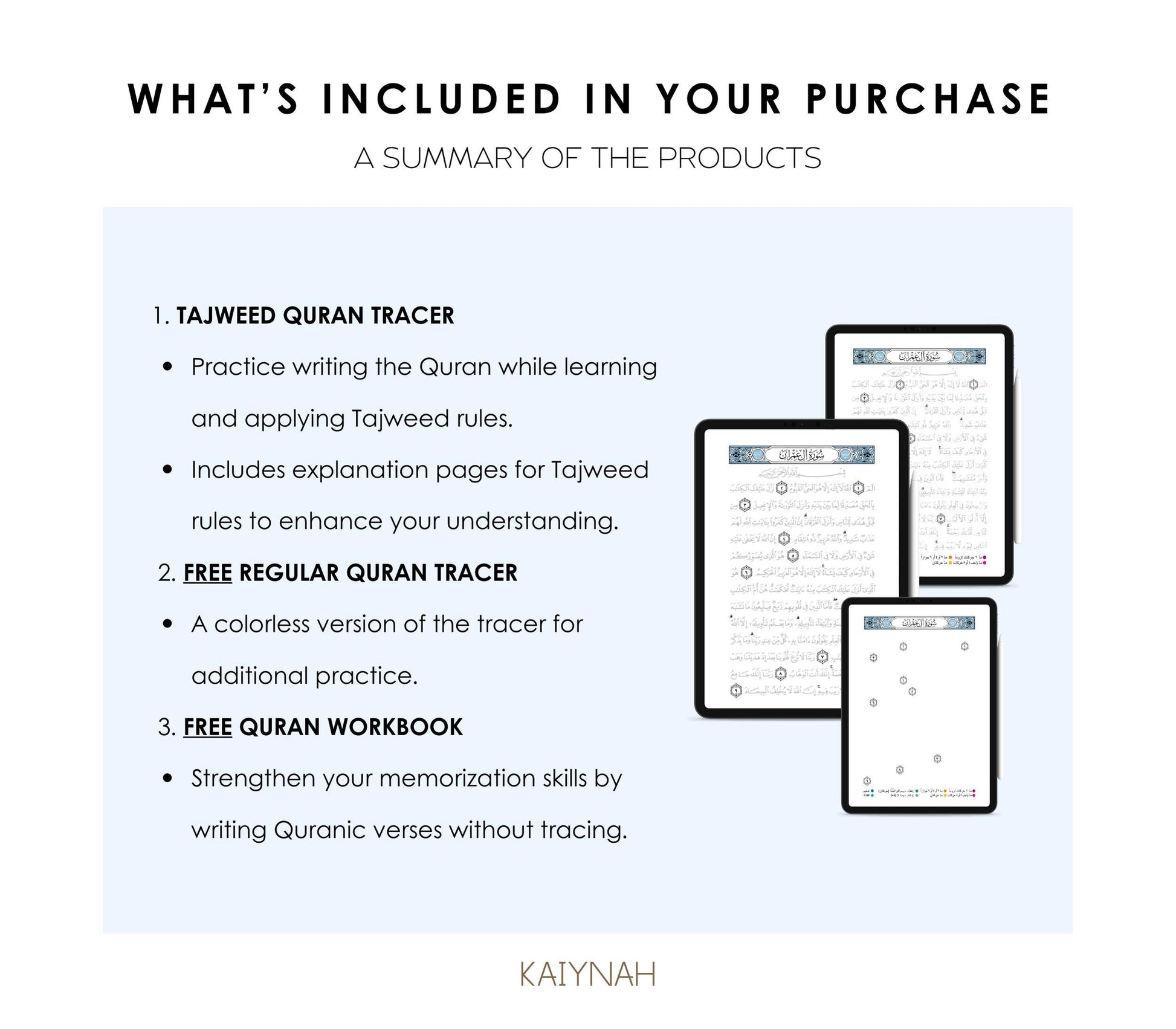 The products offer a clean, structured layout for effective Quranic handwriting practice. The purchase includes: