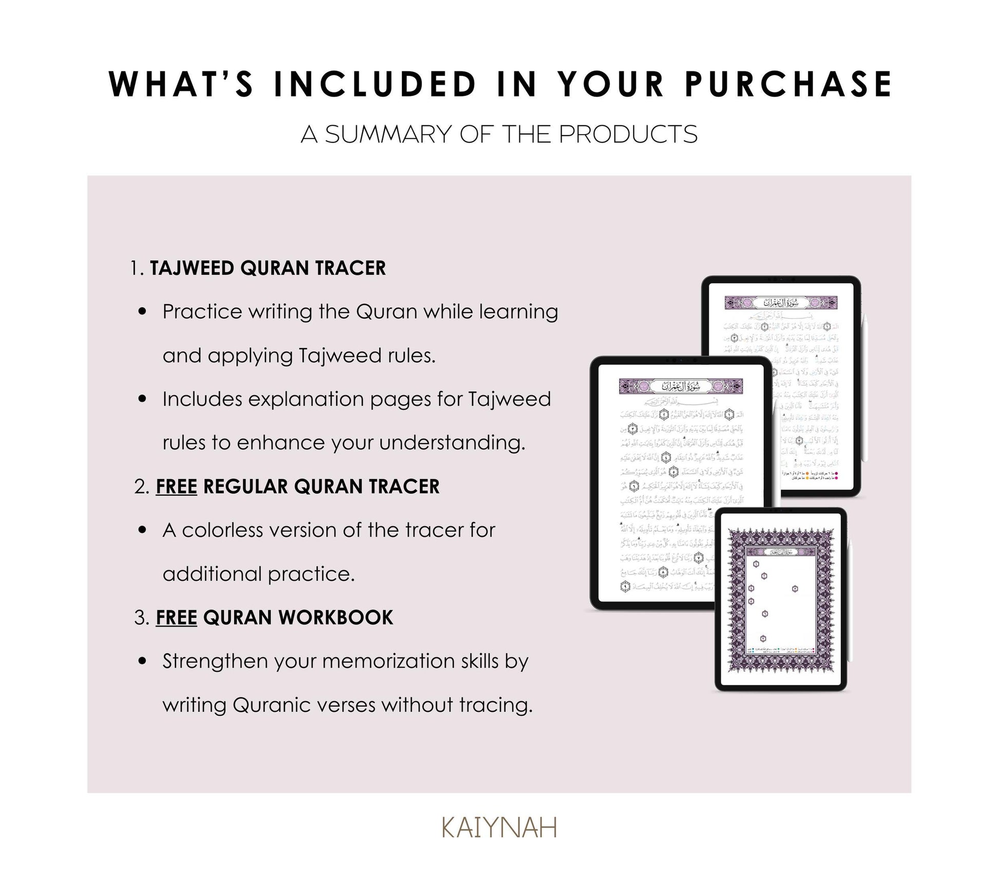 The products offer a clean, structured layout for effective Quranic handwriting practice. The purchase includes: